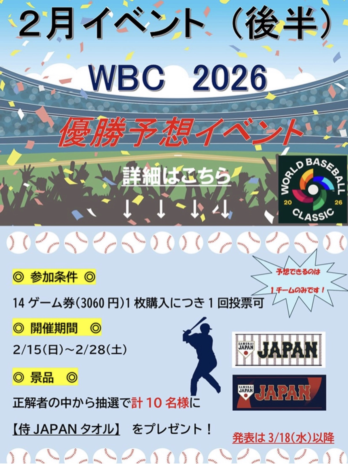 - 2026.02.16WBC優勝予想イベント開催中!